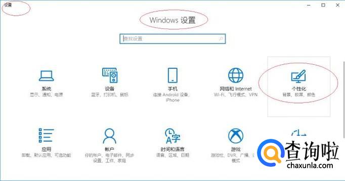 唤出"Windows 设置"程序窗口,点击"个性化"图标。