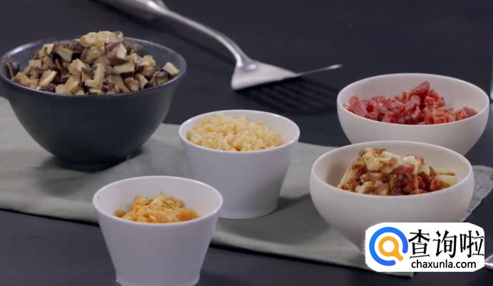 首先把冬菇泡发切丁,瑶柱用水泡软后沥干切碎,虾米用黄酒泡软后切碎,泡发瑶柱和冬菇的水要留下待用,萝卜刨粗丝,腊肠腊肉切小粒。
