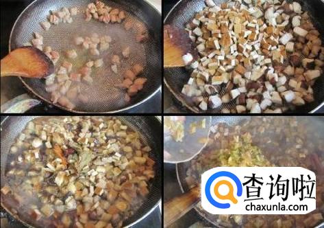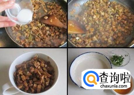 碗中放入面粉,加入少量的盐,加水调成稀糊; 接着将锅烧热, 放入少量的油,翻炒肉丁至变色后加入香菇,竹笋和豆干丁继续翻炒