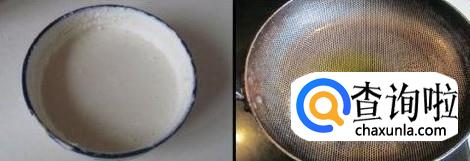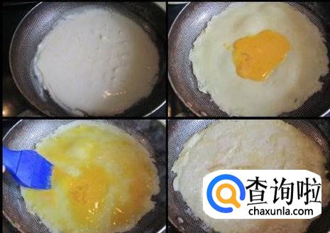 再将锅烧热,放入油烧开,倒入面粉糊摊成面皮, 面皮定型后, 在上面倒入适量的鸡蛋,用刷子将蛋液在面皮上刷上一层,将面皮翻面, 再沿着面皮边缘加入适量的油;