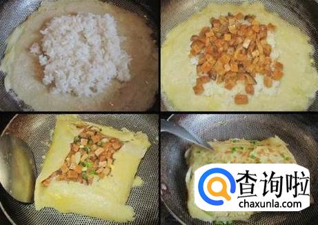 在面皮中间放好的糯米饭,再放上刚炒好的三鲜馅,稍微煎一下,将四边按压成四方形;待面皮焦黄时,撒上葱花,翻面再煎一两分钟, 再在上面撒些葱花。最后盛出盘,切块,即可食用