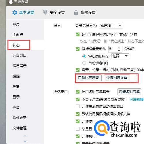 在【基本设置】栏中点击【状态】就可以看到【自动回复】的设置;