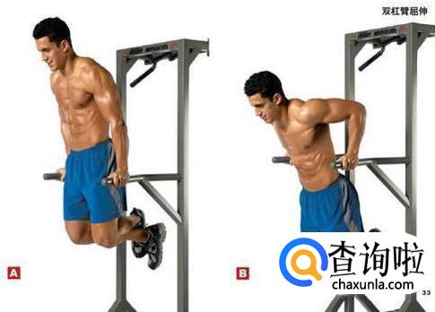 1、使用双杠最宽的间距握双杠,两臂伸直支撑在双杠上。2、两腿自然弯曲,双脚重叠,身体放松下垂;不要故意挺胸,使胸大肌的下部位垂直于地面。3、双臂屈肘使身体降至最低点,然后深吸气,呼吸的时候,双臂用力,将身体撑起。然后下落时吸气,之后反复进行练习。注意:1、双杠臂屈伸对于锻炼胸肌下部外侧效果比较好,可以帮助增加胸肌下缘宽度。2、由于双杠臂屈伸不仅是一个复合动作,更因在空间移动身体,进一步加强了训练效果。3、为了把锻炼的重点放在胸肌上,可以让下巴紧贴胸部,后背圆撑,略前倾,双脚前伸位于脸的下方。