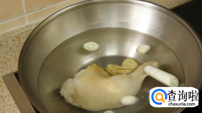 锅里加冷水,开大火加热,放入切好的大葱和生姜,再放入鸡腿,大火烧开之后转小火烧20分钟。