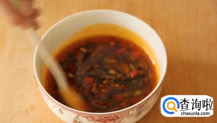 接着,将切好的大蒜、小尖椒、香葱和花生装在一起,再淋上热油,然后加入红油、生抽、醋、蚝油、麻油、花椒油和盐,一起搅拌均匀。