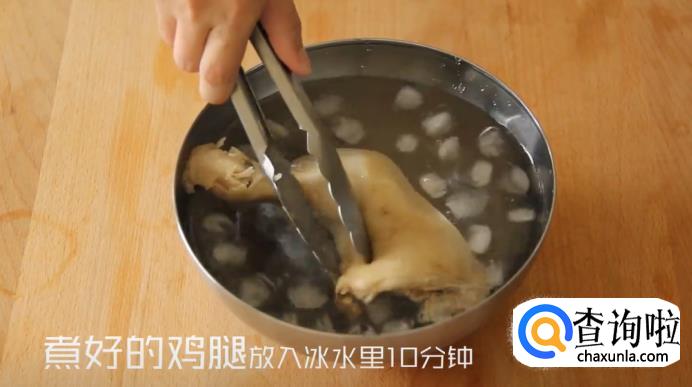 将煮好的鸡腿放入冰水里静置10分钟,然后拿出来将鸡腿切块,切好之后铺在碗里。