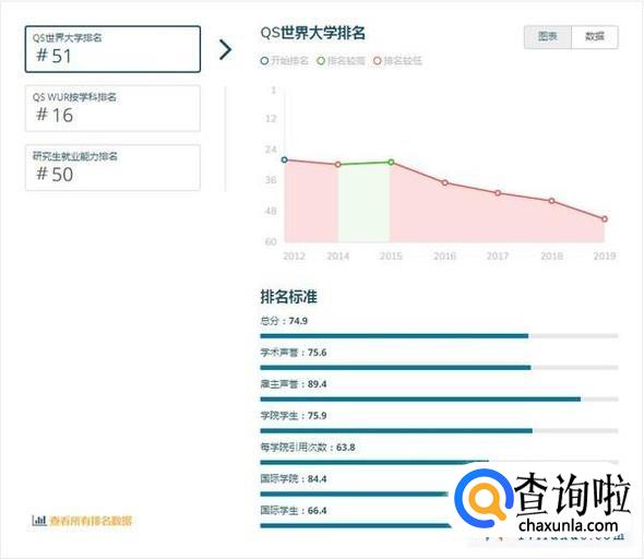 注:QS世界大学排名是世界公认最具影响力的全球性大学排名之一,主要评价指标为:学术领域的同行评价(40%)、全球雇主评价(10%)、单位教职的论文引用数(20%)、教师/学生比例(20%)、国际学生比例(5%)、国际教师比例(5%)