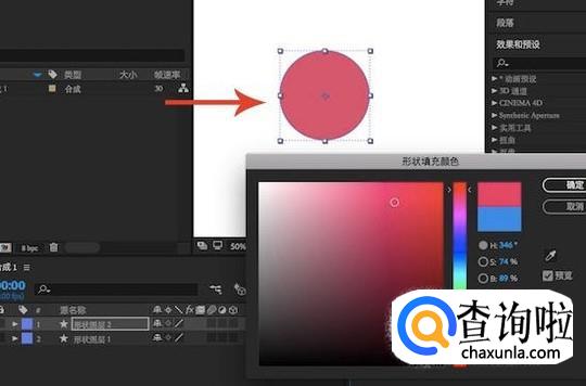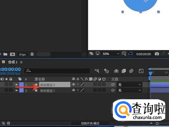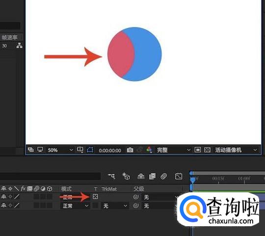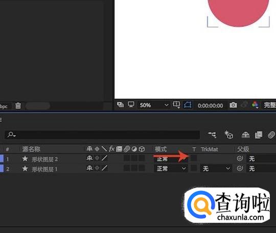 打开之后在图层面板中点击能够看到Trkmat面板了,点击下方图示位置的小窗口,记得要选择需要置入的形状。