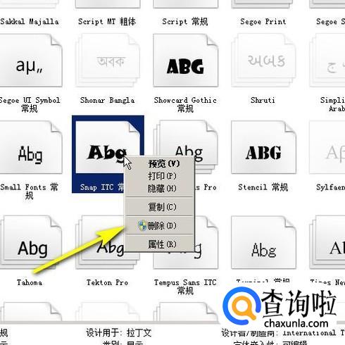 即时展开了电脑上所有已安装的字体;鼠标右击需要删除的字体,弹出右键菜单,再点“删除”即可。