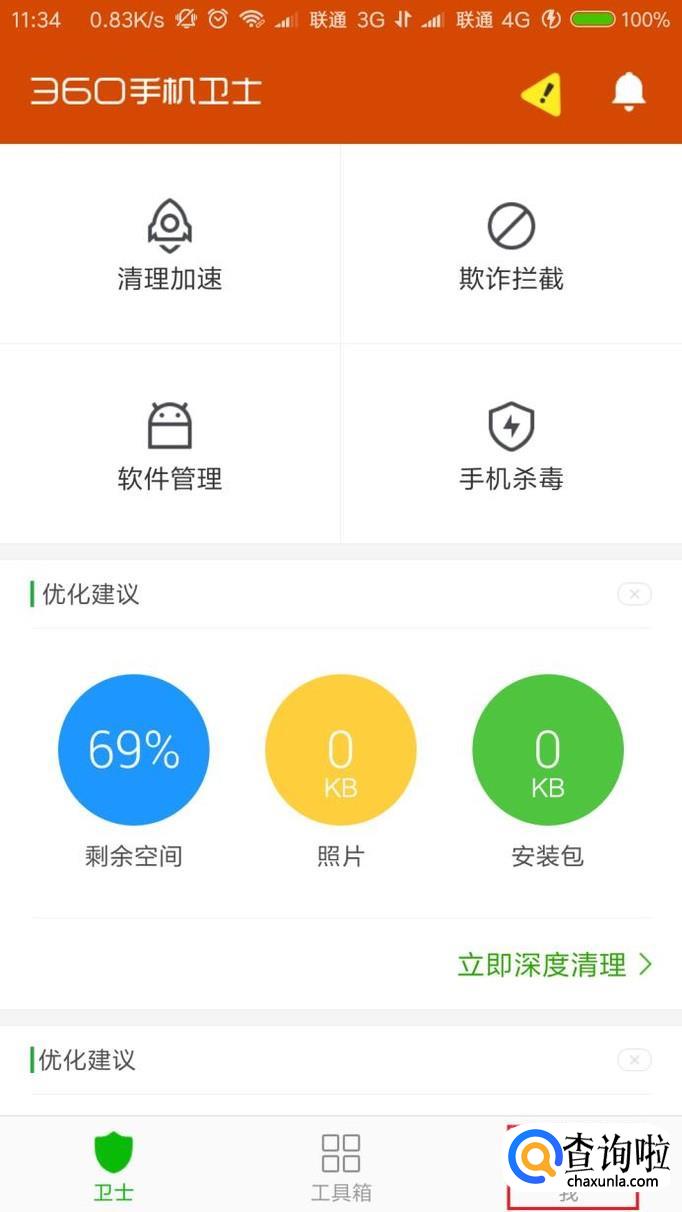 首先,打开360手机卫士主页面,点击主页面中底部“我”选项。