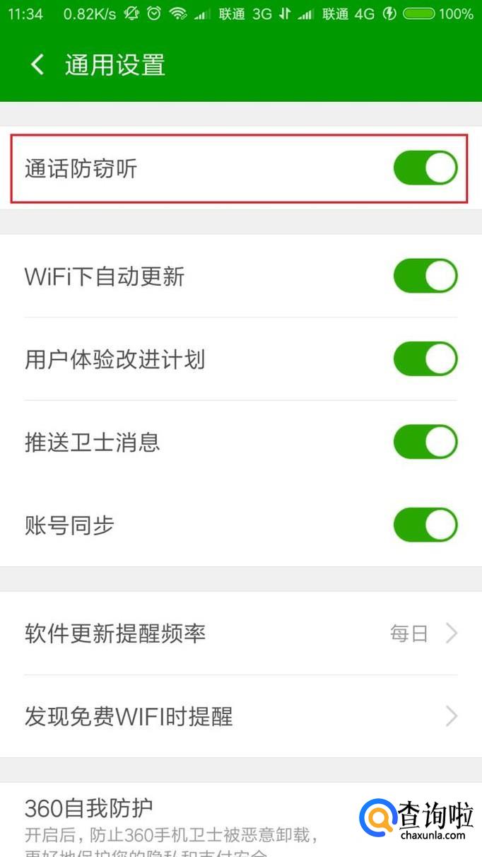 最后,在打开的设置页面中,可以看到通话防窃听的开关处于默认开启状态,证明此功能已经处于开启状态了,无需额外设置。