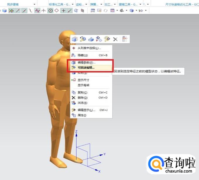 如下图所示,鼠标左键选定人体模型,然后单击鼠标右键,在弹出的下拉菜单中找到“编辑参数”或者“可回滚编辑”,点击它,会弹出“编辑人体”的工具栏。
