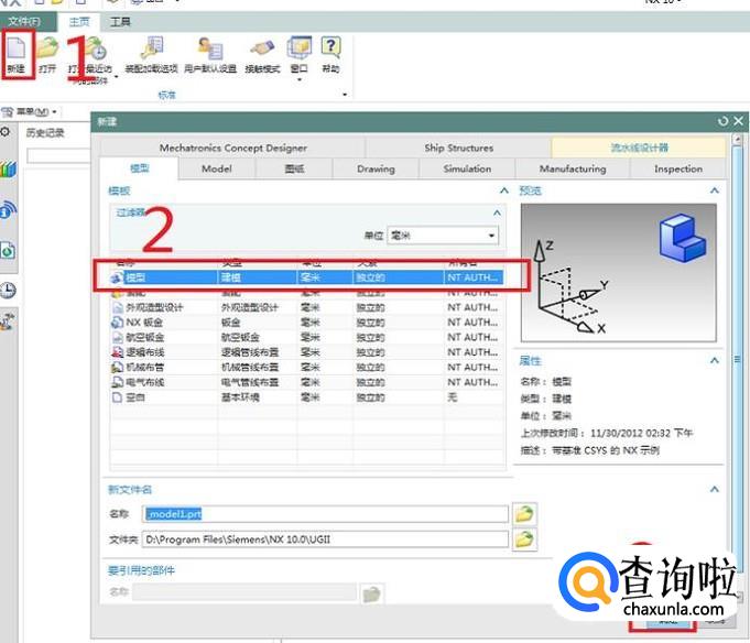 打开UG10.0软件,新建一个模型文件,具体步骤见下图红色框选1、2、3。
