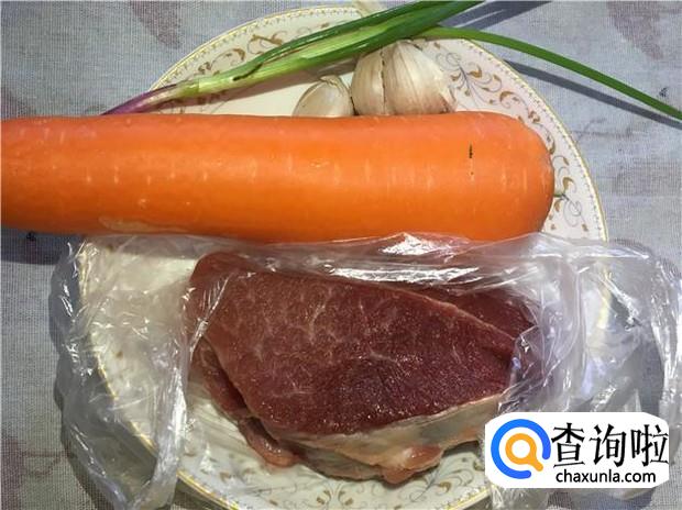 把做菜的食材准备好:瘦肉适量、红萝卜一根、香葱一根、蒜头适量。