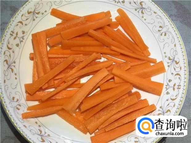 红萝卜削皮,清洗干净,切成丝状。如果有刮刀的话,可以用刮刀刮成丝状。