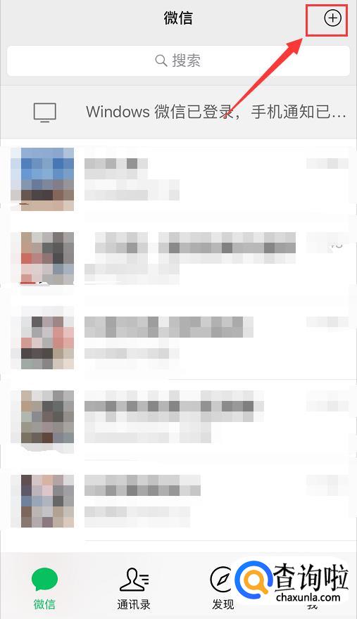 更新完毕后,进入微信,在【微信】页面点击右上角的“⊕”符号,如下图所示;