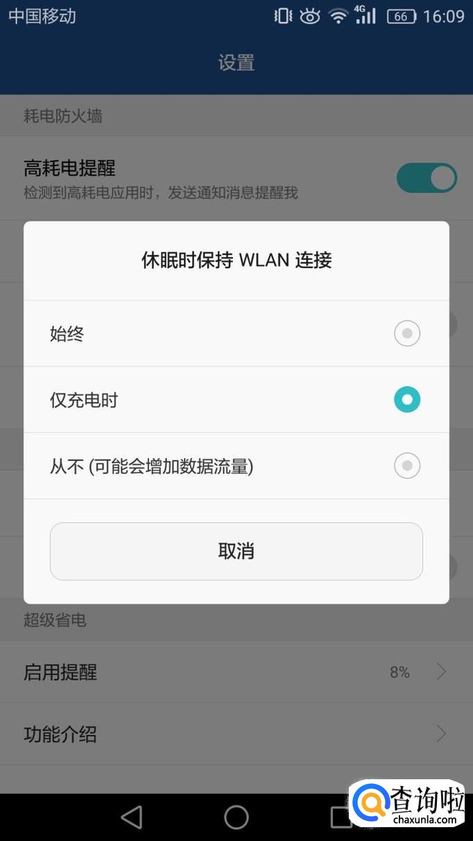 然后我们再选择始终休眠时保持WLAN连接。不会锁屏后关闭。