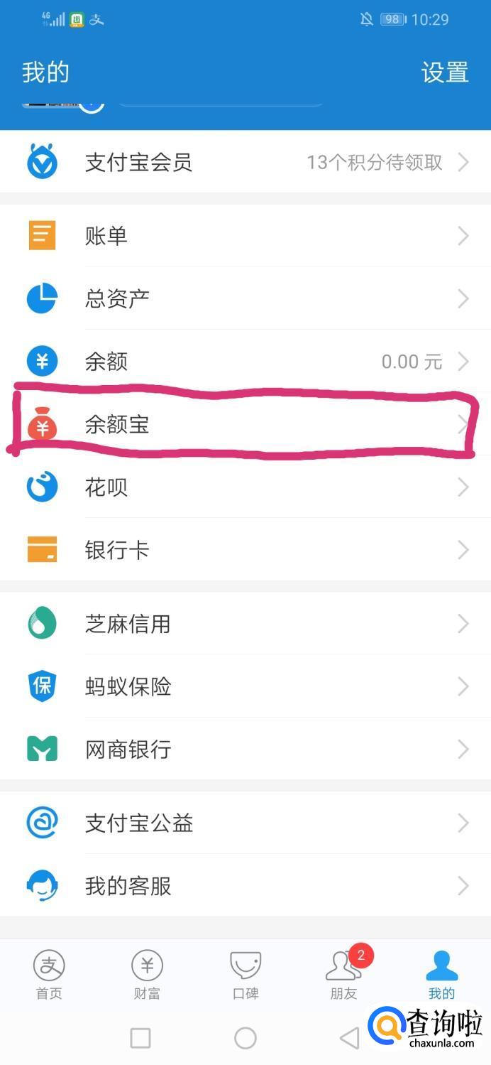 打开手机支付宝,点击右下角“我的”界面后,点击余额宝。