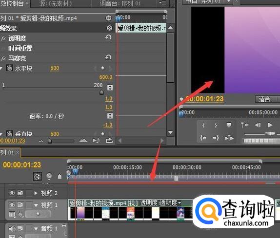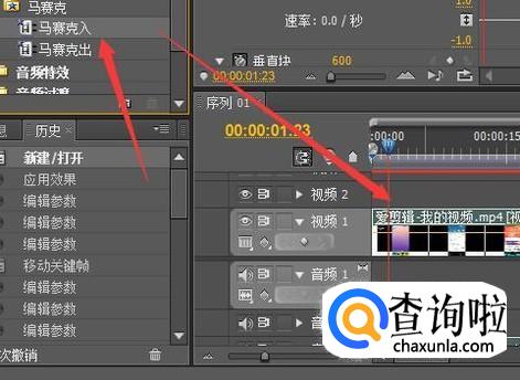 将马赛克的效果按住不放拉动到视频轨道上放手。