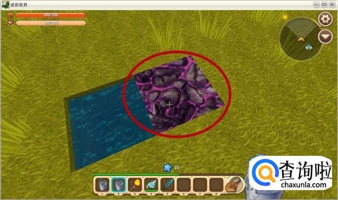 有了岩浆和水,接下来我们要在地上挖一个长2格、宽1格、深1格的坑。如图所示: