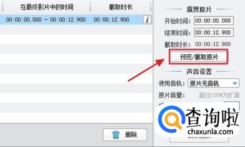 在软件页面的中间位置能够看到“预览/截取原片”的选项,我们点击它;然后弹出视频截取窗口,我们手动调整视频的开始和结束时间;