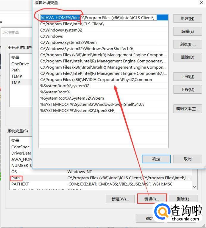 在系统变量里面找一个变量名是PATH的变量,选中——编辑,需要在它的值域里面追加一段代码:,把%JAVA_HOME%/bin;加到最前面,点击确定完成。