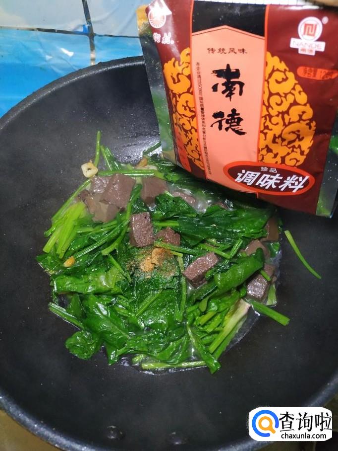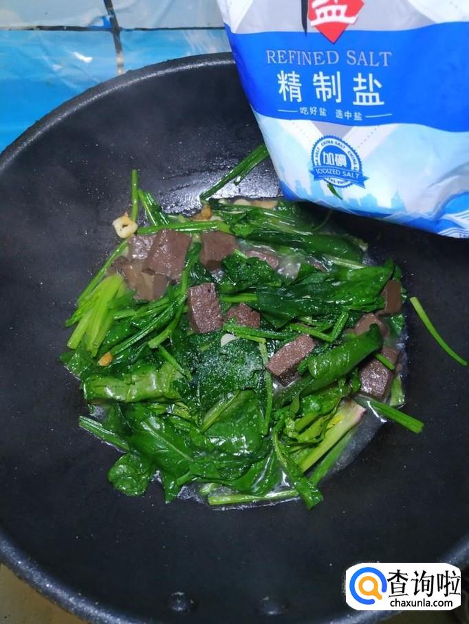 猪血适量,菠菜适量,盐适量,鸡精适量,五香粉适量,生抽适量,蚝油适量,蒜适量。