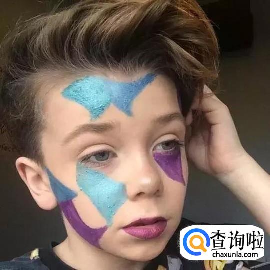 脸部色块。如果是给孩子画的比较夸张的表演妆的话,有时会用眼影在脸上画色块。表演完毕记得及时给孩子卸妆。