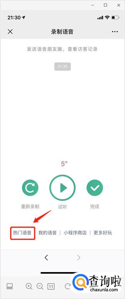 发送”语音“,它会回复你”点我发语音朋友圈“,你把它点开。