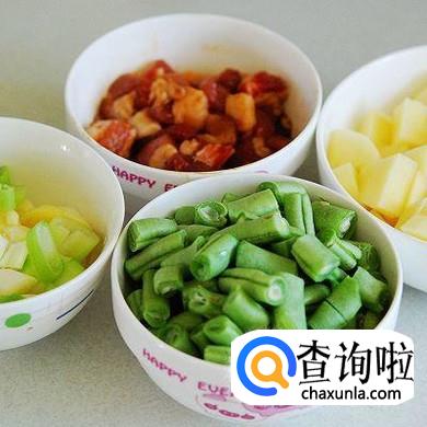 豆角洗净去丝,土豆洗净去皮,将豆角和土豆都切成丁,放置在一旁备用。如果爱吃肉也可以准备一些肉丁。将米淘好,放在电饭煲中。