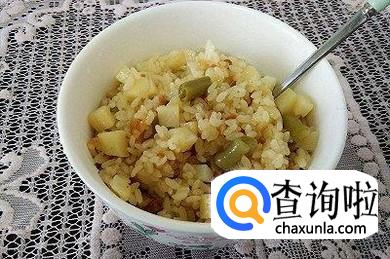 将土豆丁和豆角丁倒进电饭煲中,开始焖饭,焖好后便可以食用。