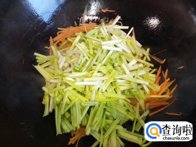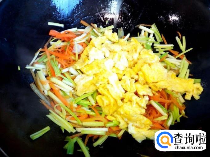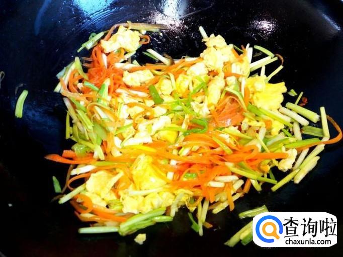 炒至胡萝卜丝变软,放入韭黄翻炒,放入盐。炒至韭黄断生,放入炒好的鸡蛋。