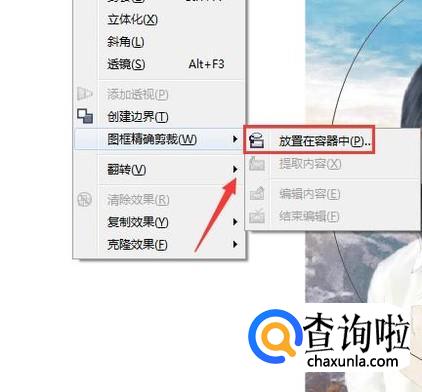 绘制好椭圆形之后选择图片,然后在效果菜单那里找到图框精确裁剪选项里的放置到容器选项,如图所示: