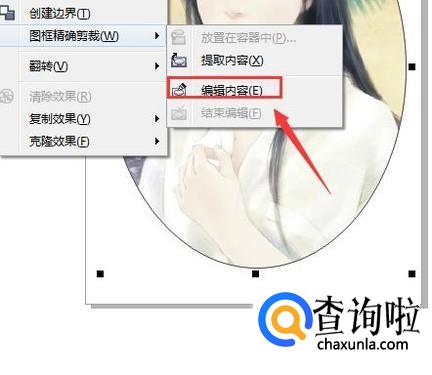选择放置到容器之后的图片再在图框精确裁剪选项里找到编辑内容选项,如图所示: