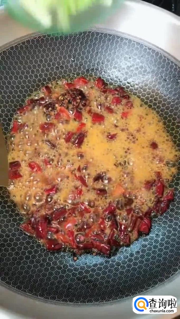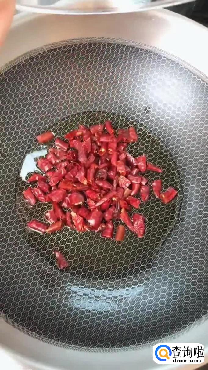 然后把干辣椒切成段倒入油锅中爆香,如下图所示。我们在爆香的过程中应该开小火。如果火开的太大是很容易让锅中的油炸开的,油贱到皮肤是很容易受伤的,这一点大家一定要注意。