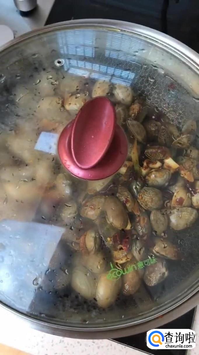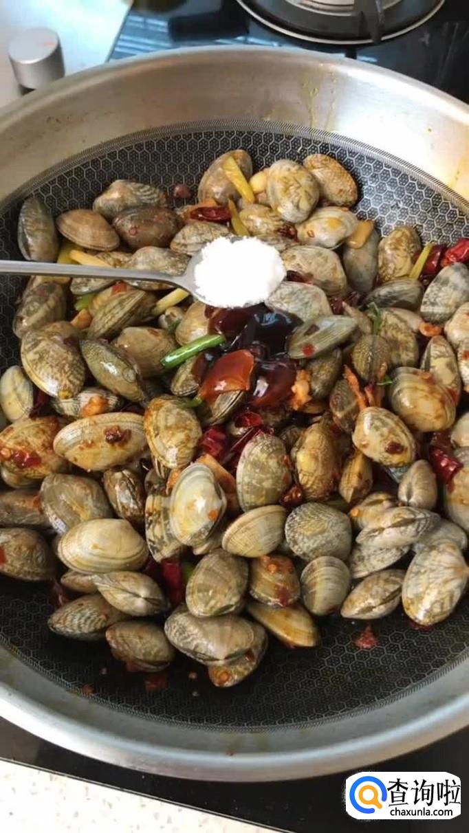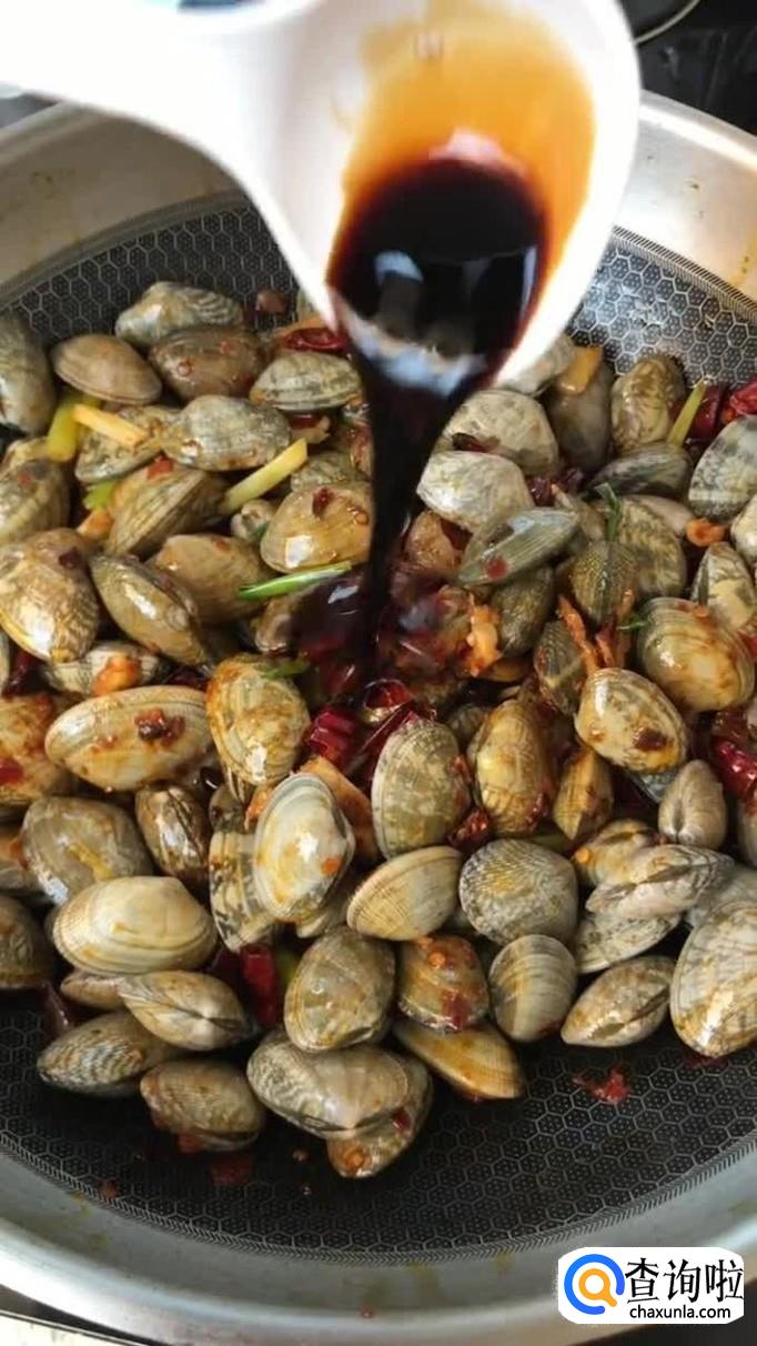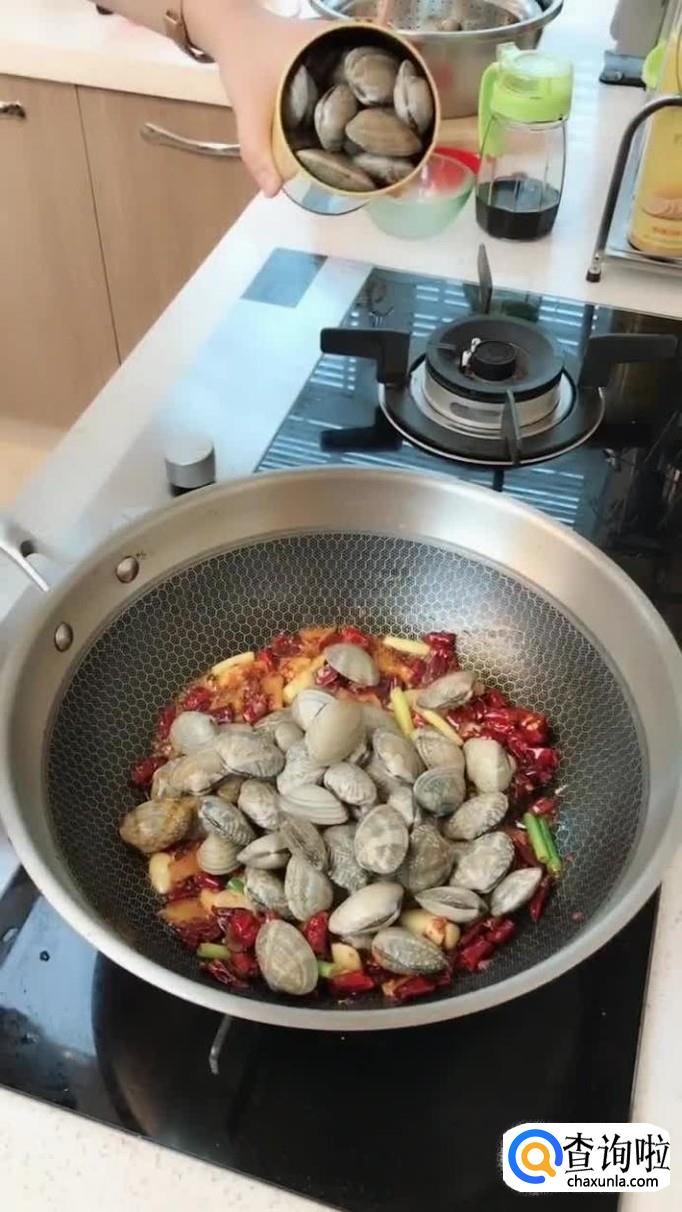 然后把花蛤倒入锅中翻炒三分钟,如下图所示。每个家庭的火候都不一样,大家可以根据花蛤是否炒开,作为判断依据。
