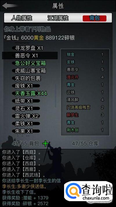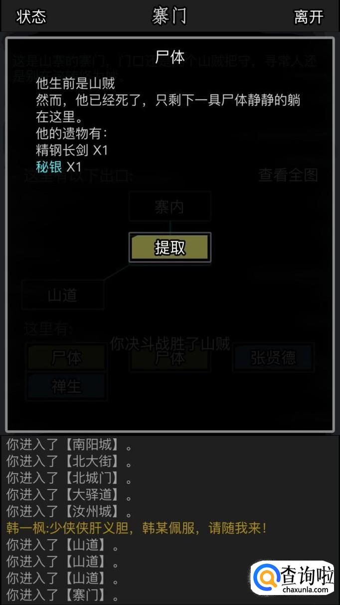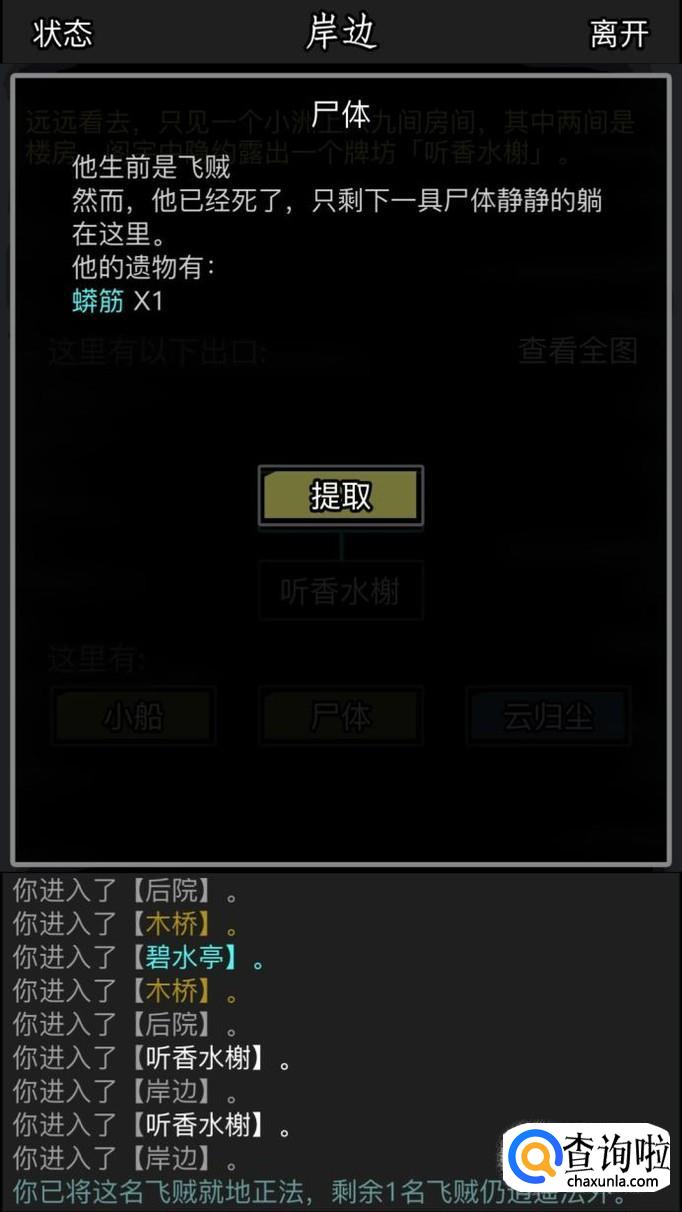 然后我们根据提示就可以找到剩下的几个飞贼了,可以检查一下尸体,可以捡到淬炼材料,一天最多出3个。