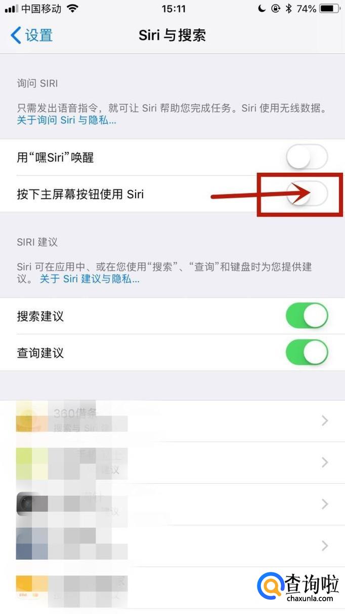 接着点击开启按下主屏幕按钮使用Siri开关,如下图所示。