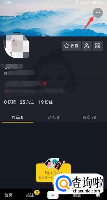 首先我们登录抖音后,在个人页面里点击右上角的小圆点图标进入设置。