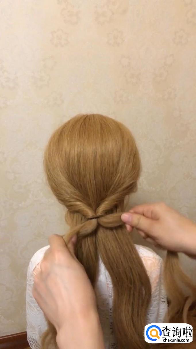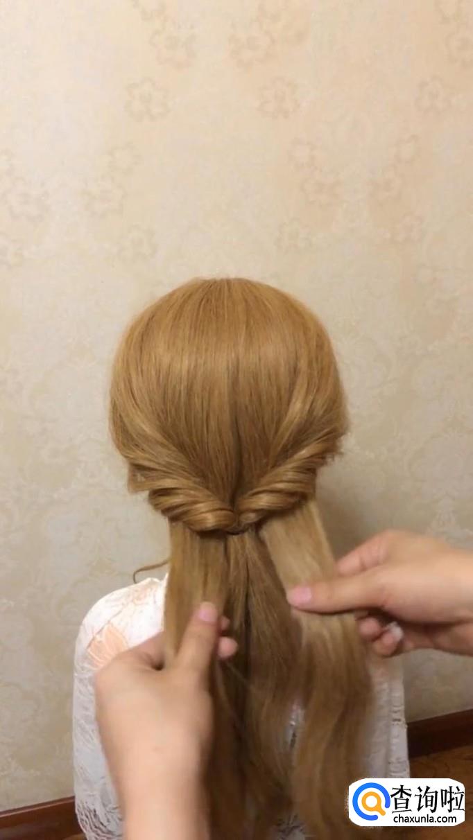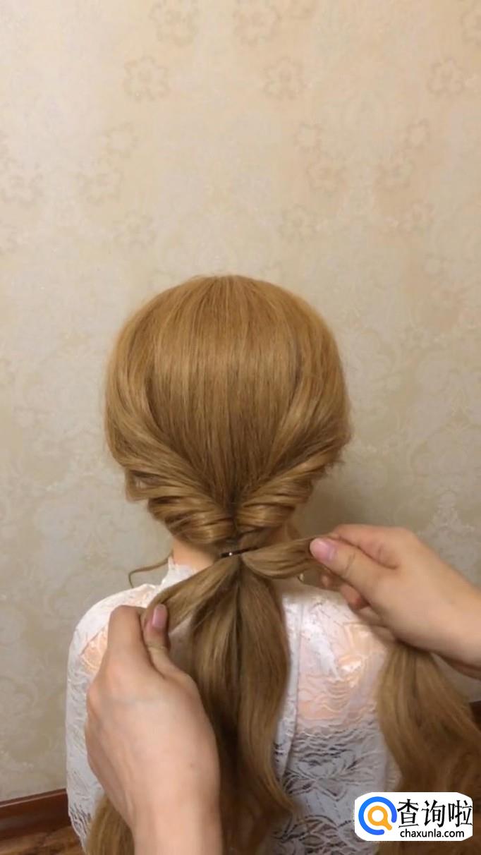 再次从剩余的头发中取出两份,从扎好辫子的两侧绕出,压在辫子上扎紧。
