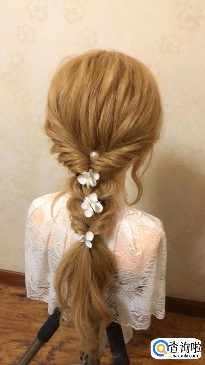 最后,将准备好的白色花饰装点在扎好的辫子上,唯美的森系沙滩发饰就完成了!