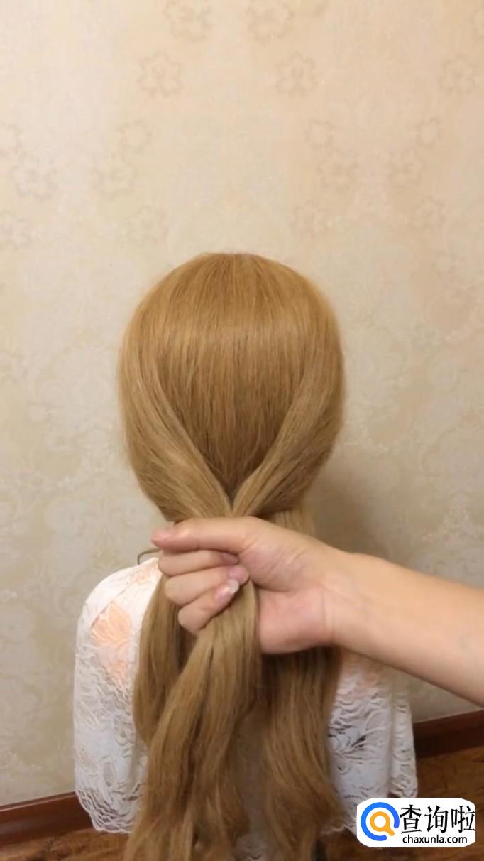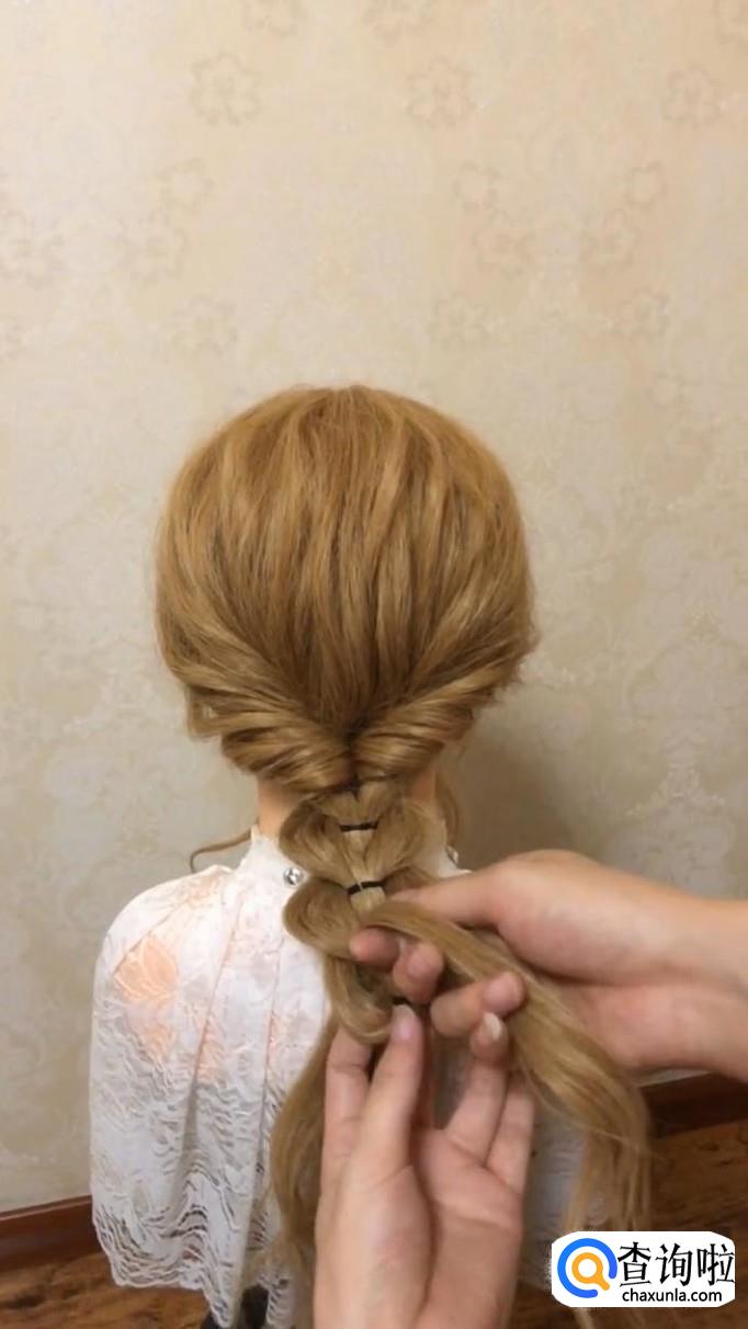 扎完后,将扎好的辫子向内翻转,翻转后用手将辫子勒紧,再将少许头发轻轻拽出少许,营造自然蓬松感。