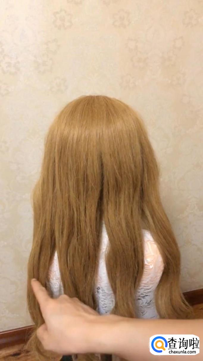 在剩下的头发中,从两侧分别取出少许,压在扎好的辫子上,用皮筋扎紧。