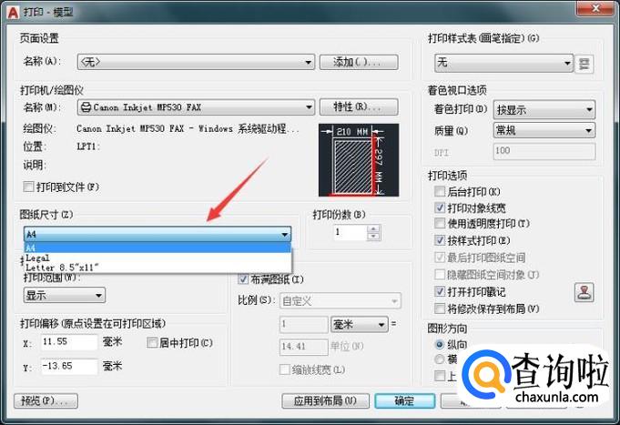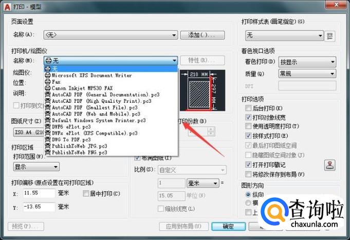 点击打印选项在弹出的对话框内找到打印机绘图仪名称选项,在这里选择我们的打印机,如图所示: