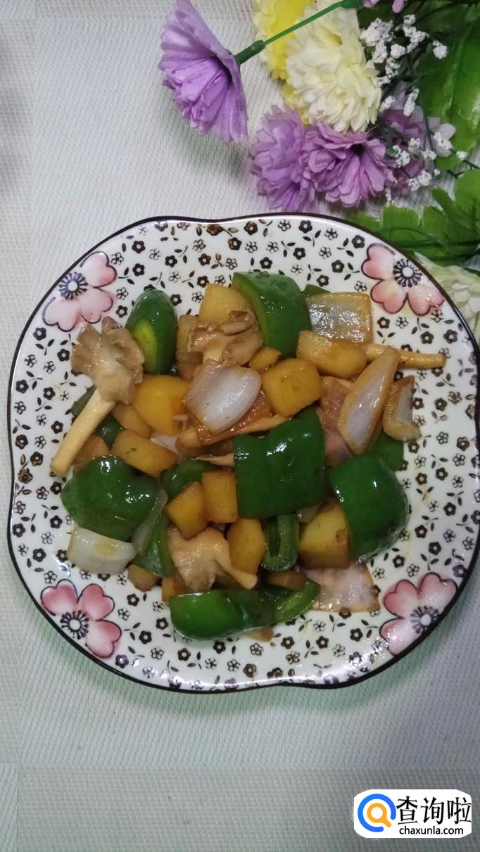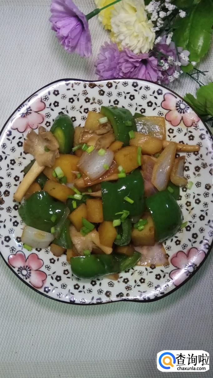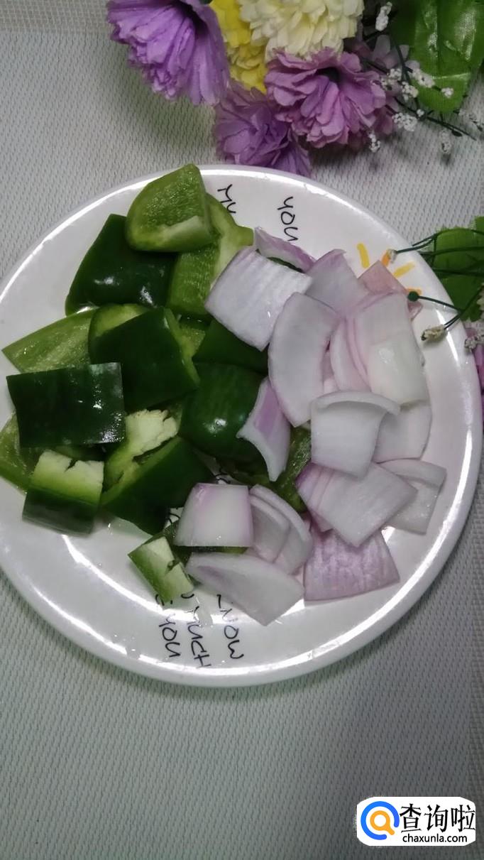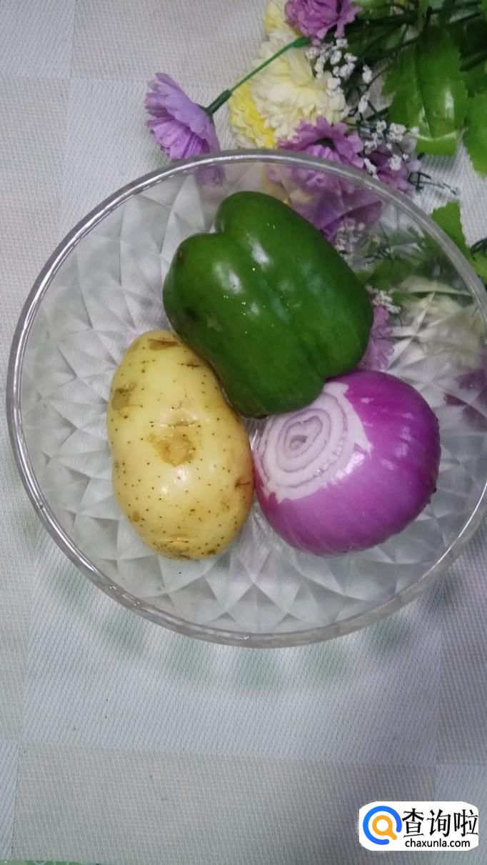 将青椒和洋葱切成方片儿,再将平菇撕成小条,将土豆洗净去皮,切块后,洗去淀粉。