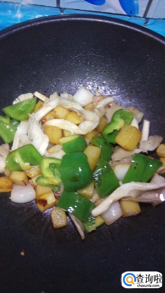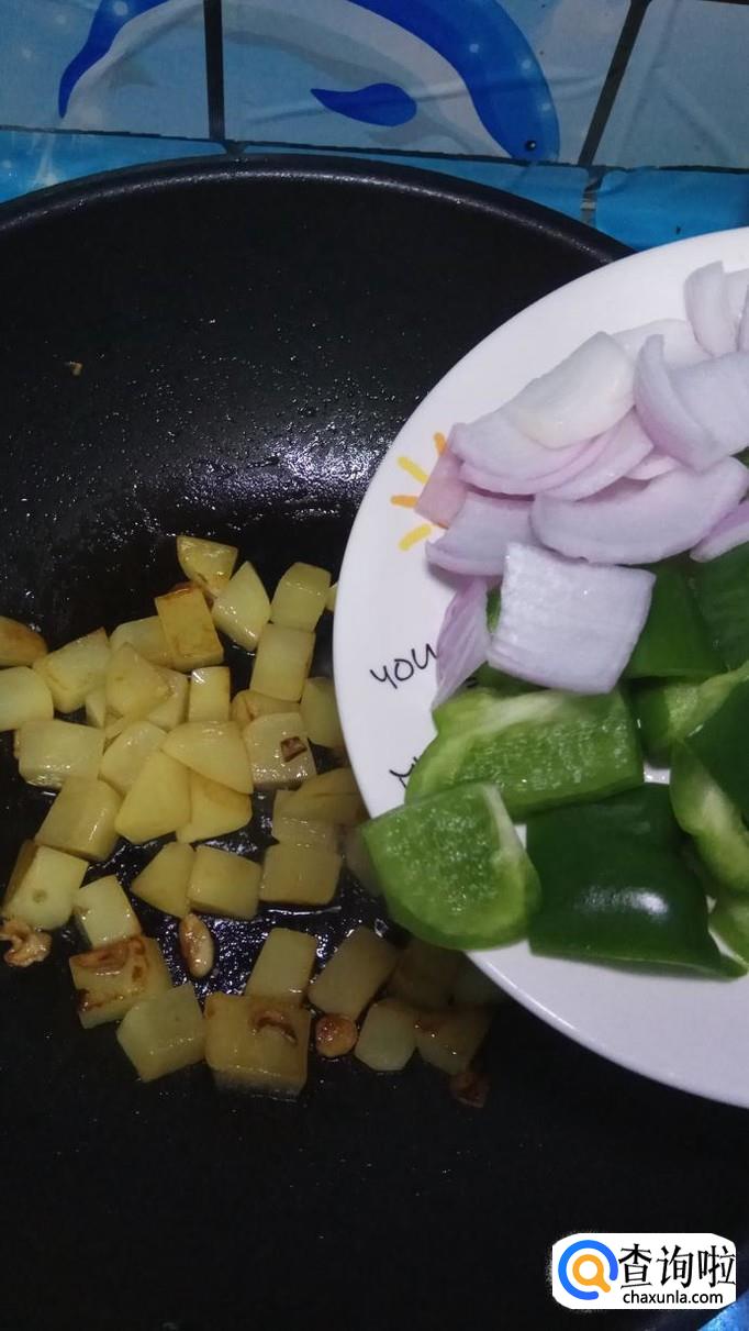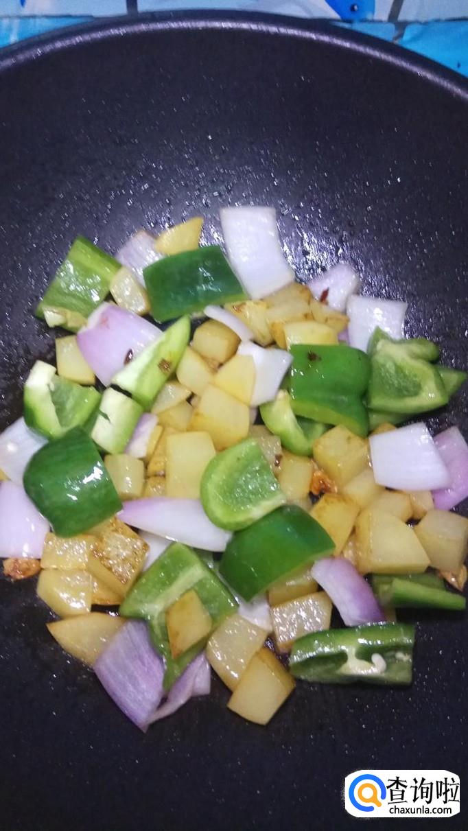 将准备好的青椒和洋葱片倒入锅中,和土豆一起翻炒,如图所示。