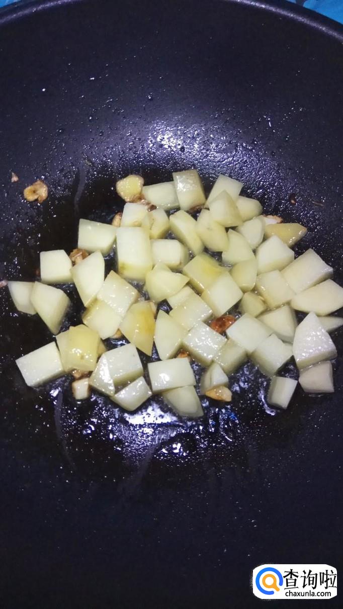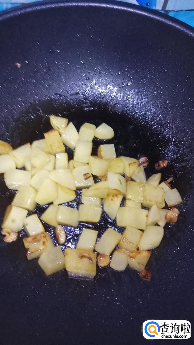 白砂糖变色后,将准备好的土豆块倒入锅中,翻炒均匀,待到均匀的裹上一层糖色,一定要注意,火候不能太大,不然白砂糖会发苦。