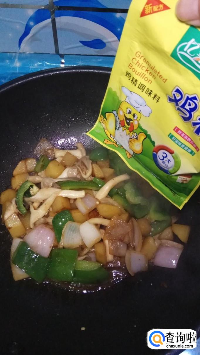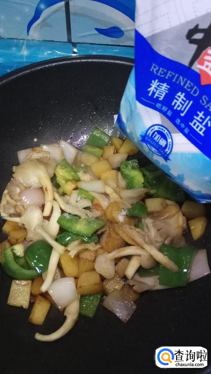 炒至平菇条变软之后,放入适量盐,鸡精,五香粉,根据自己的口味进行添加。