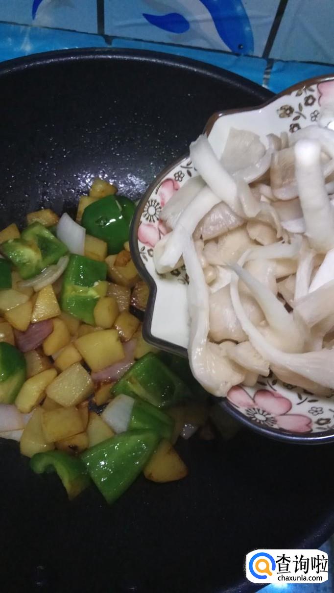 准备适量土豆,青椒和洋葱,再准备适量平菇,洗净后放入盘中备用。