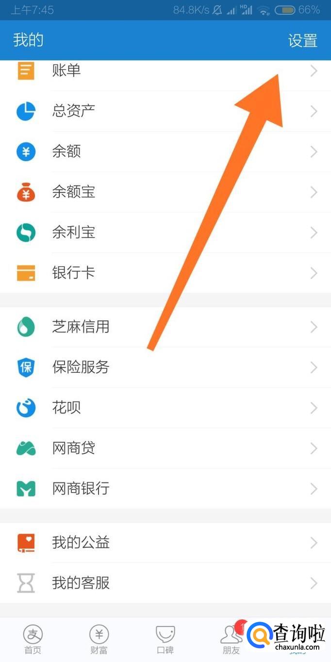 首先进入支付宝“我的”页面,点击进入右上角的“设置”选项。